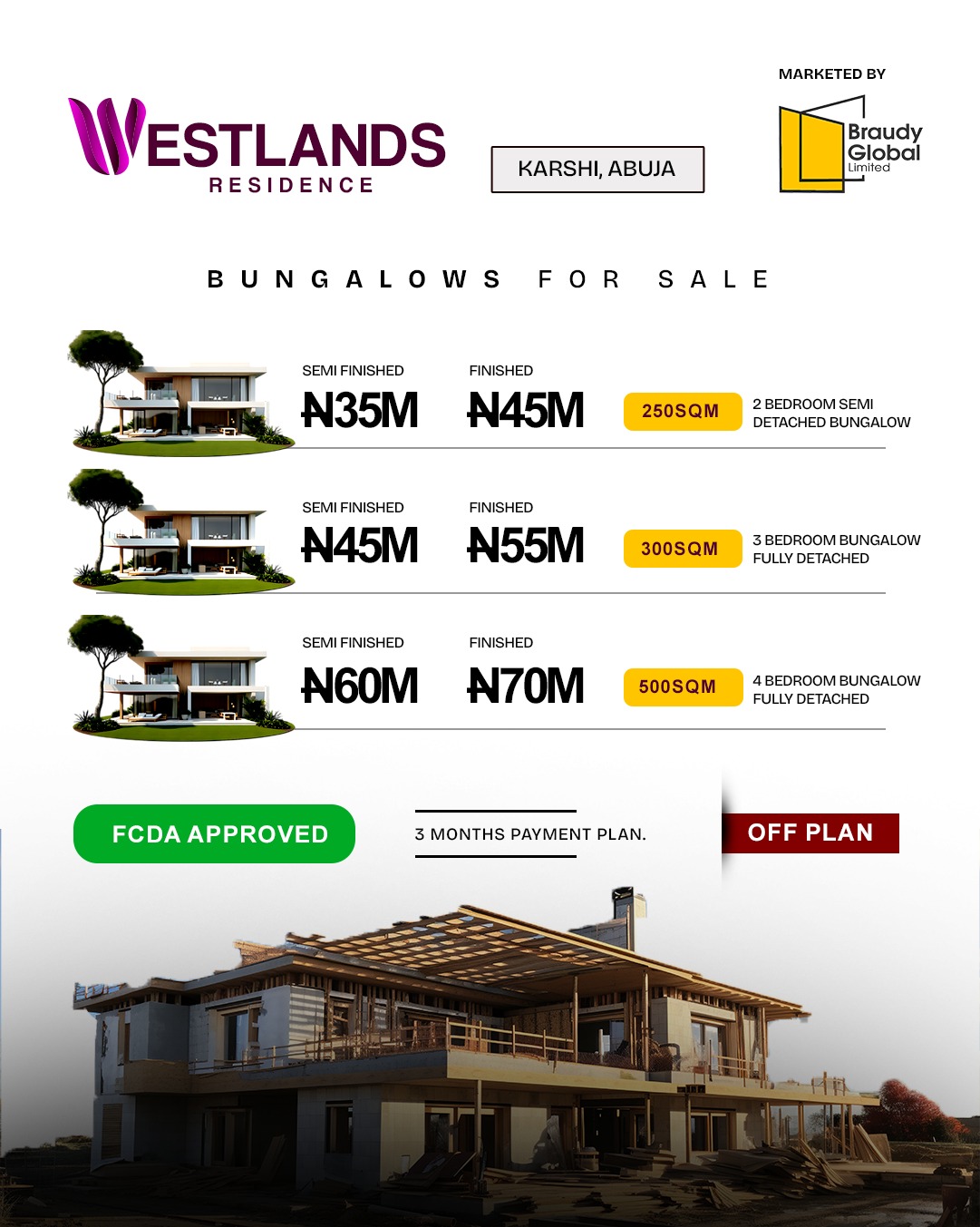 Westlands Residence is a rare opportunity to own a bungalow in a proper estate environment in Abuja — a city where apartment complexes and multi-storey duplexes dominate the landscape. For families who prioritize space, privacy, security, and the practical benefits of single-level living, Westlands Residence fills a genuine market gap. With the option to choose between semi-finished and finished states, buyers have the flexibility to match the property to their budget and timeline.